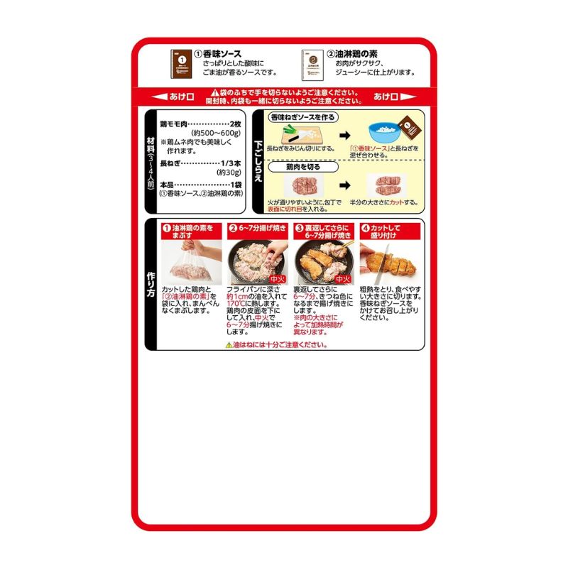 | 原材料 | 香味ソース:醸造酢(国内製造)、醤油、砂糖、水飴、植物油(ごま油、香味油)、おろし生姜、ねぎエキス、チキンエキス/調味料(アミノ酸等)、増粘剤(キサンタン)、香料、(一部に小麦・ごま・大豆・鶏肉を含む) 油淋鶏の素:コーンスターチ(とうもろこし(遺伝子組換え不分別))(国内製造)、食塩、ジンジャーパウダー、にんにく末、ぶどう糖/加工デンプン、調味料(アミノ酸等) |